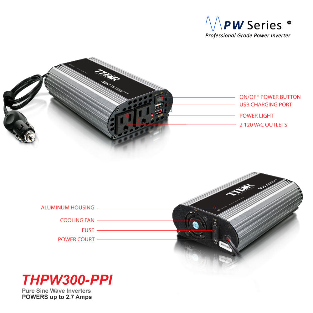 THOR Pure Sine Wave inverters have set the standard with the way you deal with your mobile power needs, providing AC electricity. A 300 watt power inverter converts the DC electricity from batteries into everyday AC power. With a 300 watt Pure Sine Wave THOR inverter you won’t need to rely on DC-powered electronics or a generator to have power for tools, electronics, or any AC power needs.