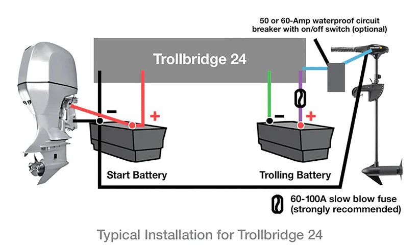 The Trollbridge 24 allows you to charge your 24-Volt trolling motor batteries from the 12-Volt alternator on your main engine, your trailer hookup, or any single or multi-output 12-Volt charger. It is designed to allow using your starting battery as one of the two (2) trolling motor batteries. It works automatically by connecting the 12-Volt starting battery and the 12-Volt trolling motor battery in series for trolling motor mode and connecting them in parallel for charging mode. It is bi-directional, so when not trolling, the second trolling battery backs up the starting or house battery. When using the starting batteries as one of the trolling batteries, you should be alert to the charge remaining so you can start the outboard motor. Using a higher capacity starting battery can help.